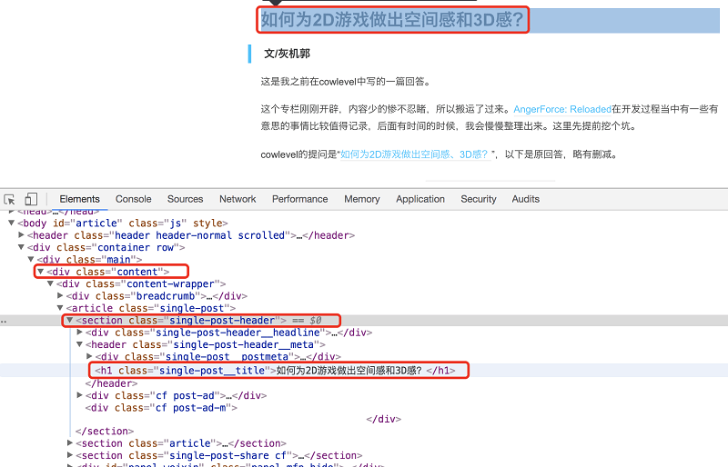 2、跟列表页的选择器一样,找到content或list之类的选择器,选择器要包含文章的标题和内容。
